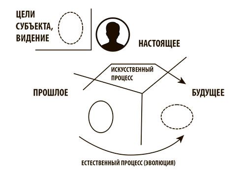 Очень важное следствие из приведенной схемы: «естественное развитие» невозможно. Об этом мы уже говорили, отличая развитие от эволюции. Развитие обязательно требует какого-то искусственного технического действия со стороны субъекта (верхняя стрелка, захватывающая все три времени). Если мы собираемся развивать бизнес, компанию, то нам недостаточно понятия «эволюции» и обязательно требуется понятие, предполагающее какое-то действие со стороны субъекта «хотения», имеющего долгосрочное видение. В бизнесе таким субъектом является именно собственник. Данная схема и есть схема его деятельности.