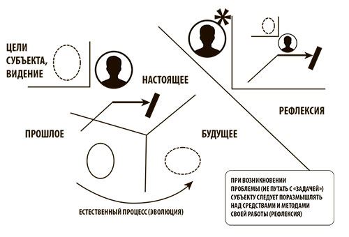 Когда субъект встречается с ранее неизвестной задачей, методов решения которой не знает и не может найти, он попадает в ситуацию, которую методологи называют проблемной. Первое, что требуется в подобной ситуации, – это распознать ее как проблемную, а не как разновидность уже известных. В данном случае слова «у нас проблемы» должны не расцениваться как «паникерство», а рассматриваться как предложение к размышлению в другом формате, а именно к размышлению в режиме рефлексии, где главное – сделать остановку, перестать делать то, что делали, и сменить предмет размышления. Теперь таким предметом должен стать не сам объект, а уже вся система, включающая и объект, и субъекта с его «образом действий», заводящим в тупик.