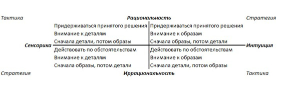 Признак тактики-стратегии задаётся дихотомиями рациональности-иррациональности и сенсорики-интуиции.