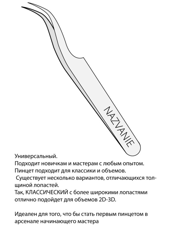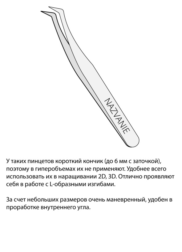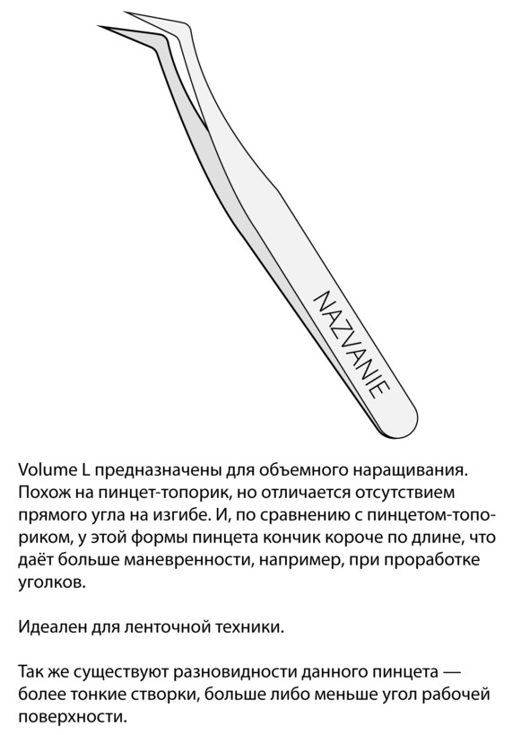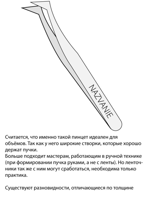 Изогнутые пинцеты необходимы для того, чтобы удерживать искусственную ресницу или пучок и, далее ставить их на натуральные. Их существует огромное множество: L-ка, сапожок, S-ка и тд. Для классики, объёмов и универсальные
