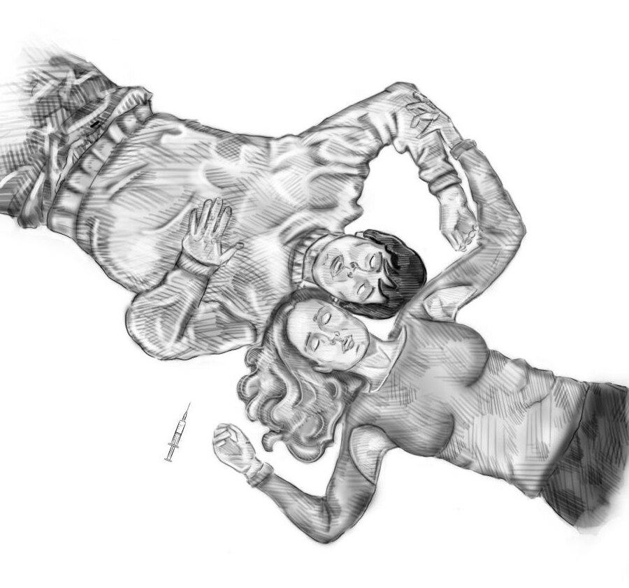 Юноша взял ложечку, насыпал немного порошка, добавил воды, после приступил к кипячению с помощью зажигалки, чтобы добиться лучшего растворения «белого». Далее парень достал шприц и взял им полученный раствор. «Подержи, красавица», – юноша передал шприц девочке. Сам же, закатал рукав, вынул ремень из брюк и перевязал им руку чуть выше локтя. Куда он собирался колоть – непонятно. Вся кожа – сплошная гематома. Взяв из дрожащих рук девочки шприц, парень аккуратно ввёл иглу себе в руку, в одну из когда-то красиво выступающих вен.
