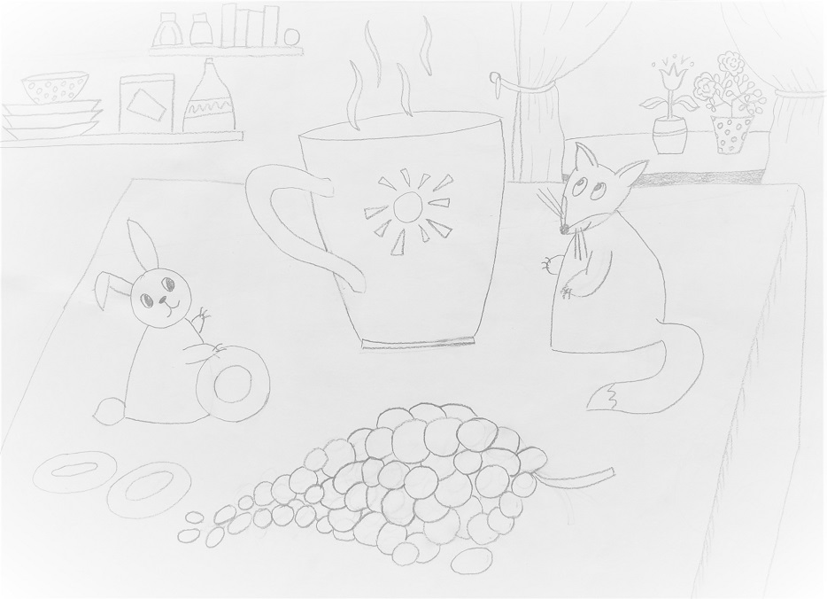 Лисёнок зажмурился, улыбнулся и расслабился. Наконец он смог оправиться от нахлынувшего на него «виноградного» ощущения и заговорить с Зайкой, который и сварил для него этот божественный компот.