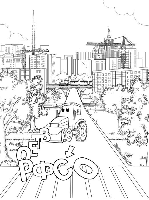Помоги Трактору сдвинуть все буквы в нужное слово. Буквы напиши на полосках пешеходной «зебры», начиная с буквы, отмеченной стрелкой. Какое слово у тебя получилось? Это очень важный предмет на каждой автомобильной дороге, особенно на перекрёстках и пешеходных переходах. Нарисуй его на свободном месте и правильно раскрась.