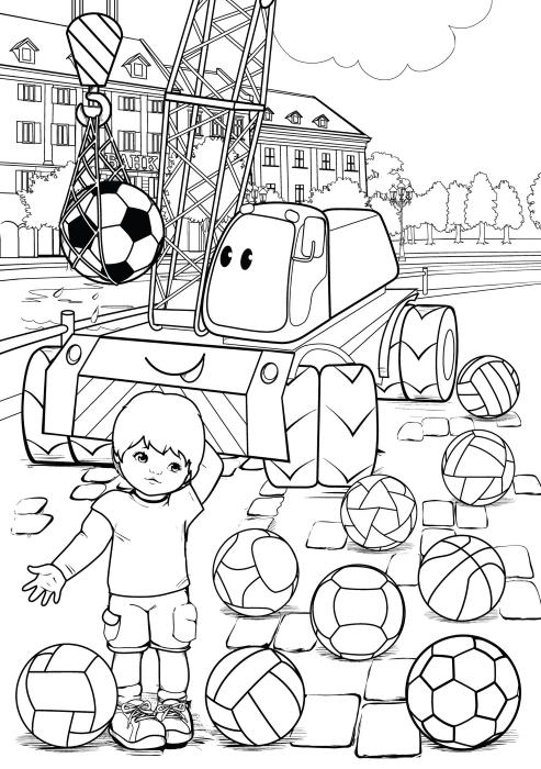 Юный футболист, упустивший мяч в реку, сразу определит среди других мячей именно свой мяч. А ты сможешь найти среди них точно такой же мяч, как тот, который Кран вытащил из воды? Раскрась его правильно.