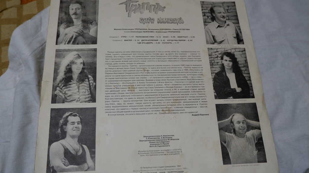 Интересно, что на конверте диска Траппа изображён какой-то старик, а на тыльной стороне фото музыкантов – участников коллектива, каждый в отдельности. Так вот слева три фотки по вертикали Трапа, я и Захаров , а справа Паша, Боря. Вася. А ведь альбом вышел в 1990 году задолго до их смерти.