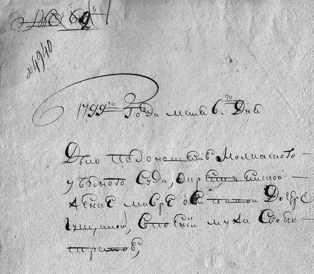 Обложка архивного дела. Центральный гос. архив Кировской обл. Ф. 1. Оп. 2. Д. 471. Надпись: «1 799-го года маия 6-го дня. Дело по доношению Нолинского уездного суда, о крестьянской женке Мавре Осиповой дочере Гущиной, в поении мужа своего травою»