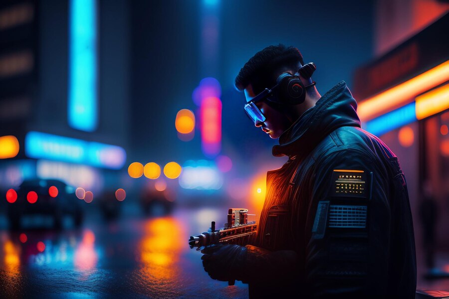 Мужчина за мановение ока оборачивается и видит перед собой подтянутую фигуру высокого парня, лет сорока, с выразительными чертами лица, глазами, представленными искусственными механическими устройствами с фиолетовой радужкой. На тело представителя програманнства группы «В-4» ложится тяжёлая кожаная куртка, усиленная металлическими вставками, отчего имеющая схожесть с бронежилетом, укреплённые твёрдой кожей штанами, и сапоги, доходящие прямиком до колена.