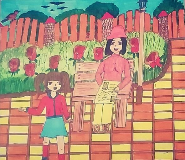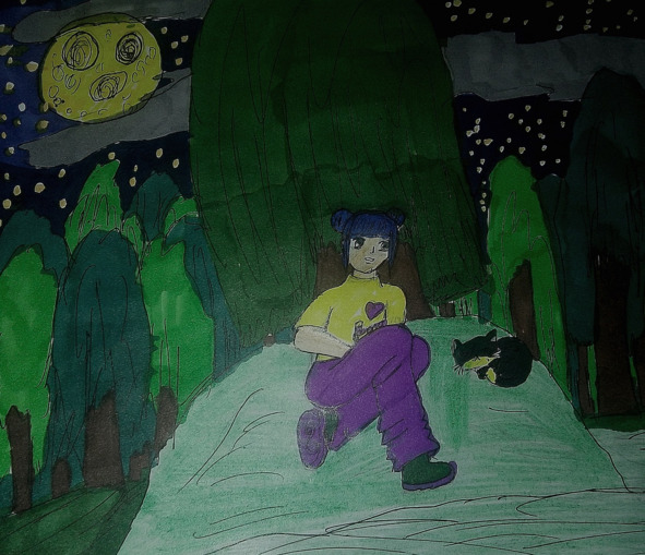 В том парке прогуливалась Ёчико. Она сидела под деревом, протянув ноги. Ёчико рисовала пейзаж. Около неё спала кошка Аса.