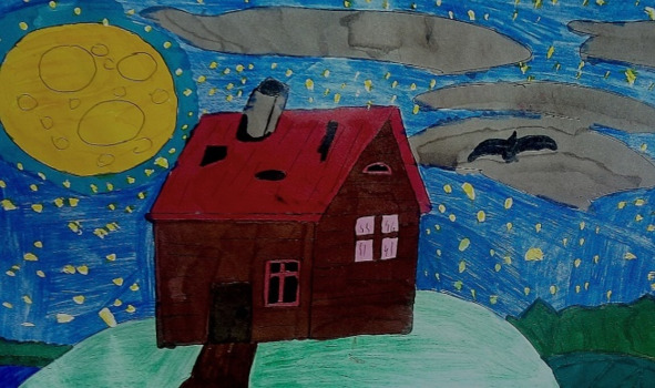В конце деревушки есть холмик, на котором стоит домик. Крыша вся в дырках, из-за которых она часто протекает и старая труба наискосок.