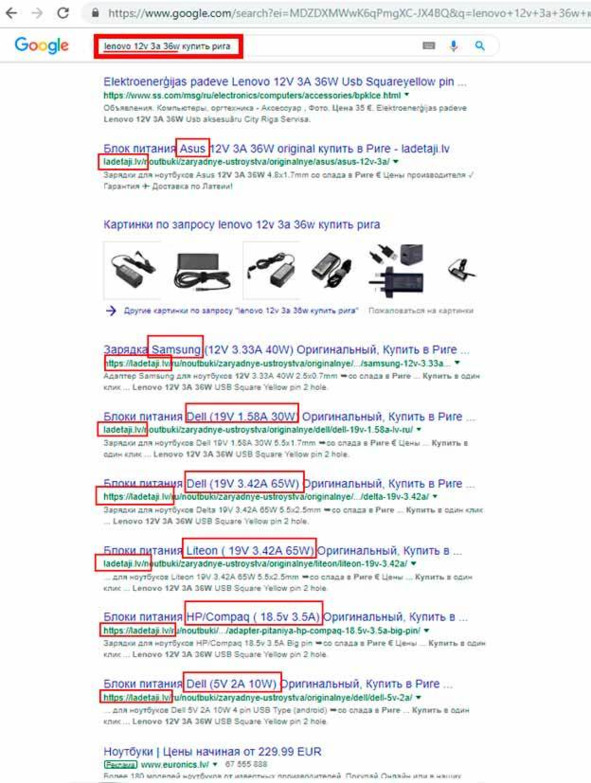 Посмотрите на пример, из которого видно, что Google определил, что в этом запросе для него главное купить в Риге, а не сам товар. Google понял, что ищется, зарядка (блок питания) для ноутбука, но почему-то проигнорировал марку и / или параметры. Заметьте, что Google СЕМЬ раз вывел один и тот же сайт, и ни разу именно ту зарядку, которую я тестировал в поиске, а она есть на сайте.