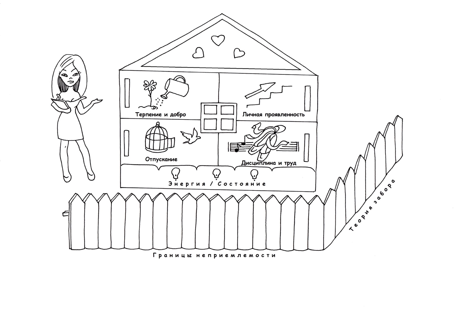 Фундамент нашего счастья – это наша личная энергия, построив фундамент, мы приступаем к строительству дома. Если мы не смогли построить крепкий фундамент, наш дом развалится от первого же порыва ветра. Далее мы строим дом – внедряем остальные инструменты и практики, которые в том числе помогают сохранить энергию и дать себе развитие. И в завершении мы окружаем наш дом, то есть самого себя, неприступным забором, чтобы никакие события и люди не смогли разрушить наше жилище.