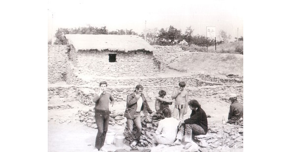 III Группа Дэги отдыхает от раскопок на фоне реконструированного дома при воротах Танаиса