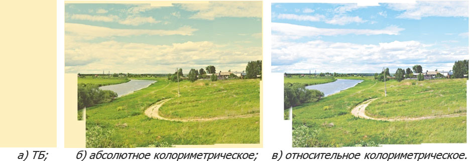 Рис. 2.1. Имитация распечатки принтера на экране монитора с использованием разных колориметрических отображений: а) точка белого, заданная в профиле; б) абсолютное колориметрическое; в) относительное колориметрическое. Получено с помощью программы RawTherapee (пояснения в тексте).