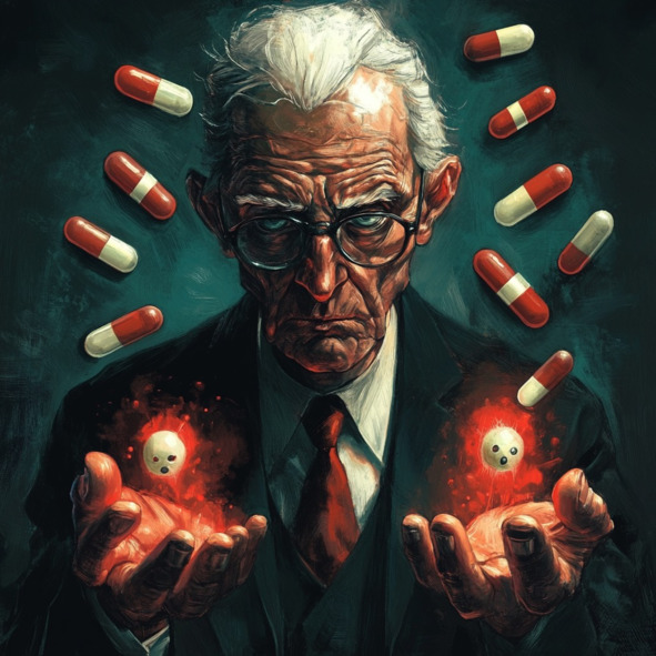 – Наконец-то у меня собраны в баночки все человеческие пороки! Покрутитесь, людишки! Вам очень нравятся мои таблетки. Всего один месяц попить их три раза в день, и навсегда будешь иметь недостатки, которые не смог приобрести при рождении. Ох, как их любят те, кто ими уже пользовался! Я не успеваю изготавливать сладости для людского безумия!