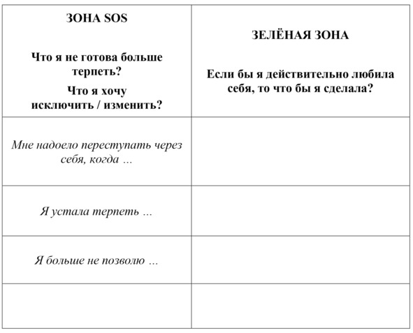 Я приготовила для тебя специальную трансформационную таблицу. Запиши в ней то, что ты точно не собираешься больше терпеть в своей жизни, что ты однозначно и бесповоротно хочешь и готова исключить.