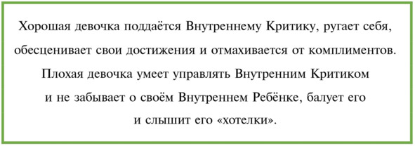 Данное противоречие можно сравнить с соотношением в нашем организме разных веществ, например глюкозы или жиров. Для работы нашего мозга и тела они крайне необходимы, но в повышенных дозах способны нас разрушить, верно? Так и Внутренний Критик в состоянии баланса может нас защищать и оказывать помощь, а в моменты гиперактивности, наоборот, подавляет женский иммунитет, вызывает раздражительность, бессонницу, повышенную утомляемость и тревожность.
