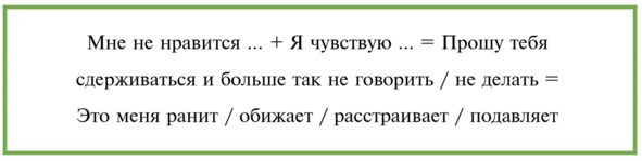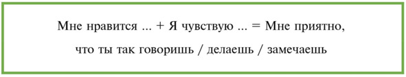 Будь внимательна. Все части формулы в практике обязательны. Это означает, что недостаточно сказать «мне нравится» или «мне не нравится», важно подкрепить реакцию-высказывание своими чувствами и просьбой о том, как бы тебе хотелось или не хотелось в перспективе.