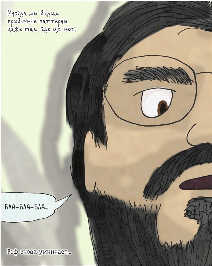 Наблюдая за тем, как быстро дети усваивают определённые паттерны в процессе обучения, мы можем убедиться, насколько наш мозг приучен ко всевозможным шаблонам и моделям. Мы ухитряемся находить знакомые паттерны даже в самом процессе поиска паттернов! Отличный пример – лица. Сколько раз вы различали узоры, напоминающие лицо человека, на деревянной поверхности, в рельефе стен или в грязных разводах на тротуаре?.. За распознавание лиц отвечает значительная часть человеческого мозга – едва вы бросаете взгляд на человека, множество нейронов моментально вовлекается в интерпретацию. Если мы во время разговора не смотрим в лицо собеседнику, то хуже понимаем, о чём он говорит, поскольку недополучаем часть информации.
