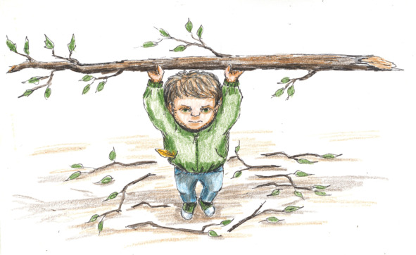 Был уже почти полдень, когда с высоты я увидел скопление ребятишек на детской площадке. Все они кричали, размахивали руками и были явно чем-то обеспокоены. Я подлетел поближе и, спрятавшись в кроне раскидистого дерева, стал наблюдать. В самом центре площадки стоял мальчик. Он держал в руках большую палку. Даже не палку, а настоящую дубину. Совсем недавно рабочие спиливали поблизости сухие ветки у старых деревьев и ещё не всё успели убрать. Мальчику было очень тяжело: его лицо покраснело, по вискам струился пот, руки и ноги дрожали. Но он не бросал свою тяжёлую ношу. Друзья уговаривали его сделать это. Они кричали, что он выиграл спор и они верят, что он самый сильный! Девочки плакали, боялись, что он надорвётся. Но мальчик стоял на своём. И я понял: у него обострилось упрямство. Знаешь, такое качество, когда человек всё хочет делать по-своему? Даже тогда, когда ему самому от этого плохо, и он уже сам это понимает.