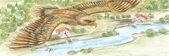 Довольный собой, я полетел к реке, потому что золотое перо нужно было отмыть. Я опустил его в воду. Но краска, которой оно было залито, никак не хотела смываться! Тогда я стал полоскать перо вперёд и назад. Во все стороны полетели брызги. Одна холодная капля воды попала мне в ноздрю. Я чихнул. Перо вылетело из моего раскрытого клюва и поплыло по реке.