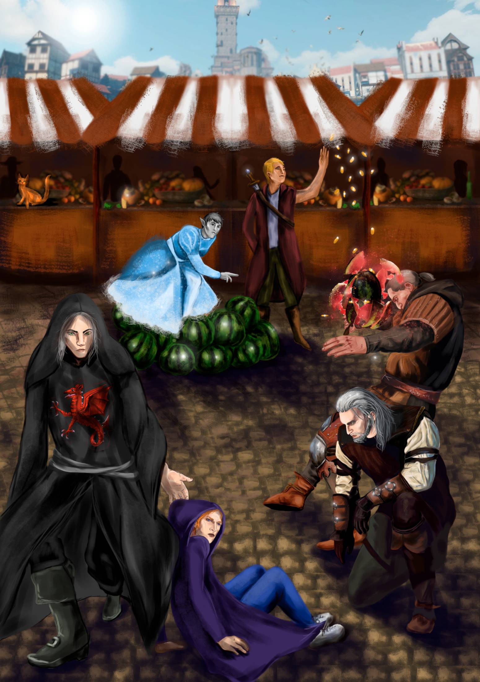 Водяной шар светлого полетел в Тео, возрастая по мере пути. Тео выставил вперёд руки, и шар попал в огненную стену. Кидок метнул кинжал в Милорна, но тот не долетел, его отбросило вспышкой белого света. Блат кинул свой стилет, но промахнулся настолько, что стилет ударился о стену и рикошетом попал в одного из стражников, которые стояли в стороне. Стилет ударил в голову, причём рукояткой, но удар был достаточной сильным, чтобы страж упал без сознания. Его товарищи по службе в оцепенении посмотрели на тело, потом на остолбеневшего Блата, похватали копья и ринулись вперед с намерением заколоть обидчика. Недолго думая, вор кинулся бежать, причём по кругу, где стояли мы.