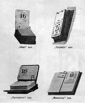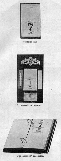 К началу XX века календари стали массовой продукцией, которая производилась на бумажно-печатных фабриках, оборудованных специальными календарными машинами (для нарезки бумаги, печати и брошюровки изделий). Один только каталог петербургской фабрики Отто Кирхнера включал более трехсот наименований календарной продукции в год. Среди календарных изданий: еженедельники, табель-календари (на год и на каждый месяц), настольные тетрадные календари, отрывные и перекидные календари, календари – записные книжки, карманные календарики. Разнообразием отличались материалы, из которых производились календари, и дизайн в их оформлении. Вечные календари изготовлялись в виде вращающегося круга (можно было узнать день недели в прошлом и будущем), существовали перекидные на металлической или деревянной основе (из различных видов дерева), универсальные из металла (числа и дни недели в них можно было менять с помощью вращающейся рукоятки), календари в настольных приборах, с ртутными термометрами и барометрами, с пластинками для записей. Функционал таких календарей был различным. Поэтому в употреблении было, как правило, несколько видов календарей, среди которых печатный – обязательно.