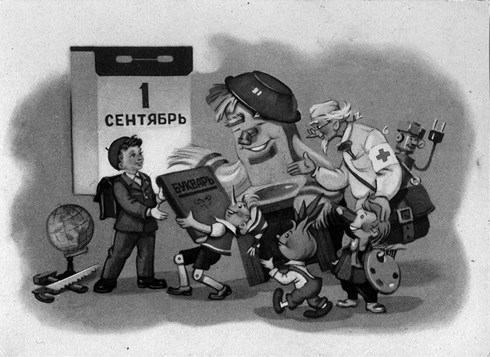 Открытка к 1 сентября с изображением отрывного календаря и персонажей детских книг. Художник Игорь Знаменский. 1960