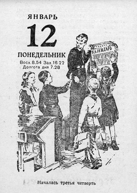 Пока методисты дошкольного воспитания разрабатывали календари с элементами настольной игры, издатели школьных календарей составляли календари-памятки для учеников. Такие календари отличались минимализмом в содержании и простотой в оформлении: табель-календарь вместе с правилами для учащихся, напечатанный малым форматом на газетной бумаге. Суровым был не только стиль календаря, но и стоявшая за ним советская жизнь с рабочими субботами и редкими праздниками. Так, в январе 1946 года был только один праздник (22 января – день памяти Ленина и 9 января 1905 года одновременно), а новогодних выходных не было совсем. Февраль, март и апрель вообще обошлись без единого праздника, как и три летних месяца. В мае было два праздничных дня (1 мая – День смотра боевых сил трудящихся и 9 мая – Праздник победы), 3 сентября – Праздник победы над Японией (оба победных праздника были отменены уже на следующий год), в ноябре один день – годовщина революции, а 5 декабря – День сталинской конституции (для сравнения, в школьном календаре на 1914 год было больше четырех десятков праздничных неприсутственных дней, не считая воскресений и вакаций). Суровостью веяло от страниц с правилами поведения для учеников как в школе, так и за ее пределами: подчинение старшим беспрекословное, форма изложения императивная, дисциплина полувоенная, а взыскания вплоть до отчисления96. Такой календарь, как партийный билет, советскому школьнику нужно было держать у сердца (формат соответствовал нагрудному карману).