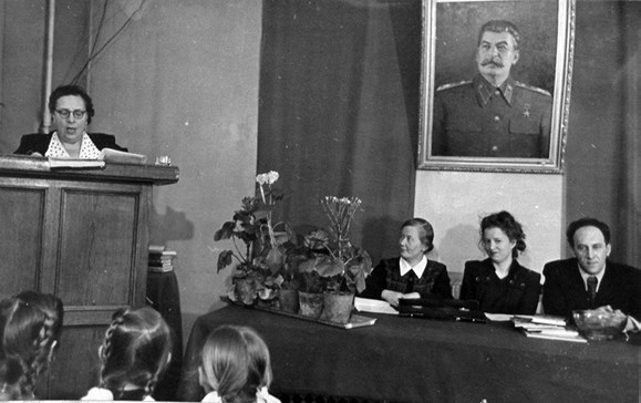 Детские писатели общаются с юными читателями под портретом Сталина. Ленинград. Дом детской книги, 1953