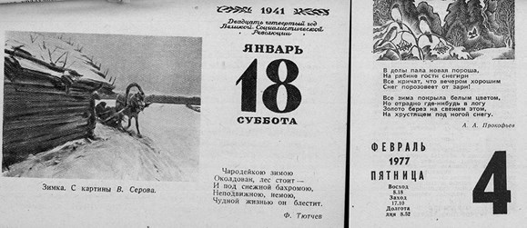 Пейзажная лирика в советских отрывных календарях для детей. Детский календарь на 1941 год. М.: Детиздат ЦК ВЛКСМ; «Календарь школьника (отрывной)» на 1977 год. М.: Политиздат