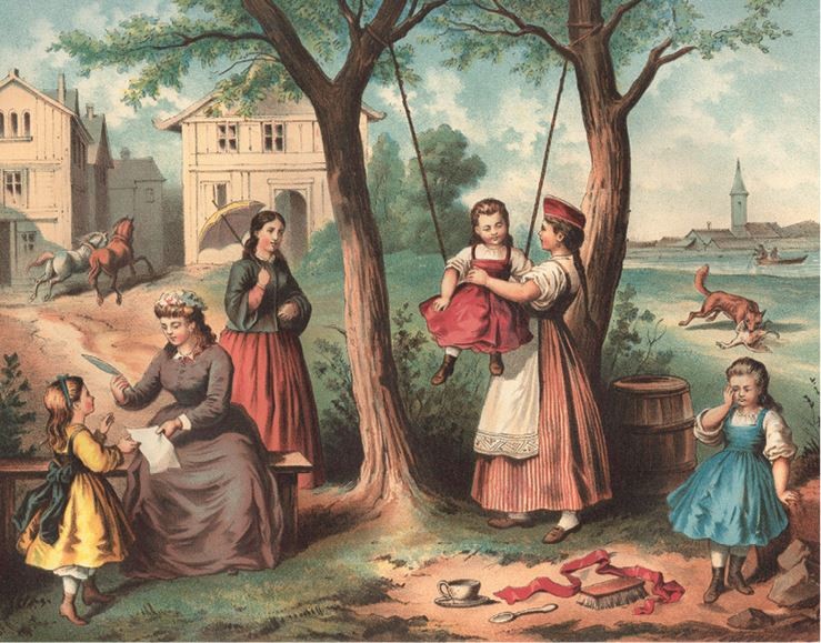 Картинки из жизни дворянских девочек. Ребенок, не приученный к порядку, не допущен к играм и занятиям. Дети одеты в модные платья с элементами русского костюма. Лошади и охотничьи собаки на заднем плане маркируют мир мужских занятий (Дараган А. Елка. Подарок на Рождество. Азбука с примерами постепенного чтения. СПб.: тип. Вт. отд. Его Имп. Величества канцелярии, 1846)