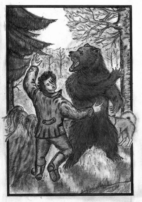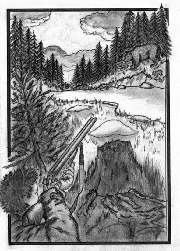 Уже в два дня он сбыл медведей,Свой получив сполна расчёт:Лишь утром слышали соседи,Как удалялся вертолёт.«Вот, жаль ещё медвежью шкуру,Что пропадать зазря добру?» —Решил тут вечером он хмурымК ручью вернуться поутру.На этот раз рекою, в лодке,Он плыл, не взяв с собой ружья.«Тогда и шкуру за находку,Коль с кем столкнусь, представлю я.»Причалил. Лесом да болотом —Версты четыре от реки.Своя на то была охота —Шагать по топям напрямки.Заметив издали пропажу,Был зол расчётливый ФедотИ от досады крякнул даже:«Не дремлет дошлый наш народ!»Но, подойдя поближе малость,Был неприятно удивлён:«Лишь крови лужица осталась.Исчез, как будто… ожил он!?»Да-a-a, было вовсе не похоже,Что кто-то был незваный здесь.Ползли, свербя, мурашки кожей,Сбивая вмиг с Федота спесь.– «Должно быть, оглушило зверяОголодавшего зимой,Ударив вскользь покатый черепСвинцовой пулей боевой». —И вдруг почудилось внезапно,Что… шевельнулся лес едва!Чуть покачнулись елей лапы,Шепталась жухлая трава.Казалось – кто-то неприметноСледил за ним со всех сторонИ тени таяли рассветноПод крик испуганных ворон!Был он не робкого десятка,Хоть не привык лезть на рожон.«Дай бог, чтоб всё сошло мне гладко». —Похолодев, подумал он.Он шёл, пугаясь каждой ели,Боясь легко попасть впросак,А мысли тишиной звенели —Последним стать мог каждый шаг.Вдруг разорвался по-над боромНад самым ухом жуткий рёв,Как будто петь собрался хоромДесяток бешеных коров!