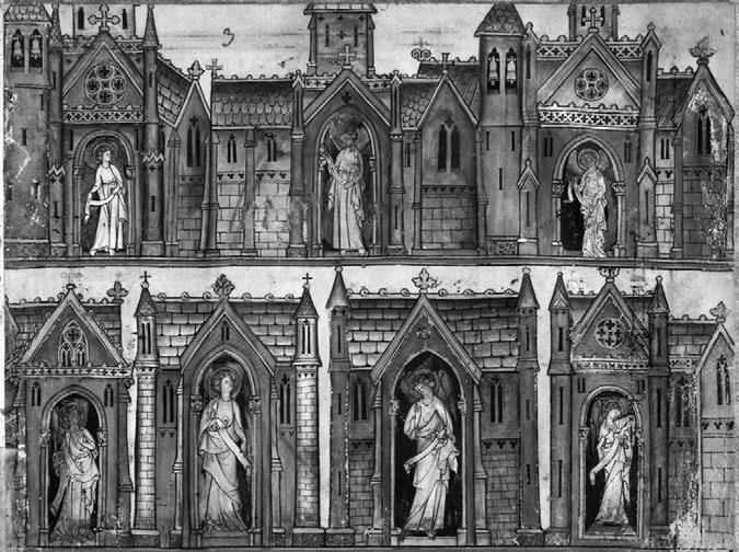 Рис. 3. Красочные соборы с легко распознаваемыми колокольнями, крышей, выложенной каменной черепицей, с розами над готическими порталами и ангелами в белых облачениях посреди дверей – все эти детали кодируют образ послания семи церквам. Франция, конец XIII в. Paris. Bibliothèque nationale de France. Lat. 14410, fol. 3v.
