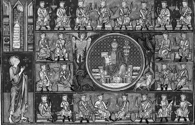 Рис. 5. Иоанн видит Агнца с семью очами и семью рогами, раскрывающего книгу за семью печатями (Откр. 4–5). Центральная композиция окружена Четырьмя живыми существами и музицирующими старцами, падающими ниц. Франция, конец XIII в. Paris. Bibliothèque nationale de France. Lat. 14410, fol. 7v.