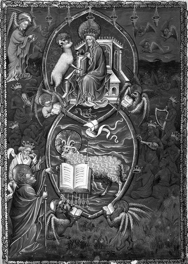 Рис. 6. Посреди семи подсвечников на престоле сидит Сын Человеческий, подле него Агнец (золотые нимбы с вписанным внутрь крестом указывают, что оба есть Христос). Слева изображён один из старцев, объясняющий экзальтированному Иоанну, что Агнцу дана сила открыть Книгу за семью печатями (Откр. 5). Четыре живых существа, славящих Его, начиная с II в. н. э. трактовались как персонификация апостолов. Нидерланды, конец XV в. Paris. Bibliothèque nationale de France. Need. 3, fol. 6r.