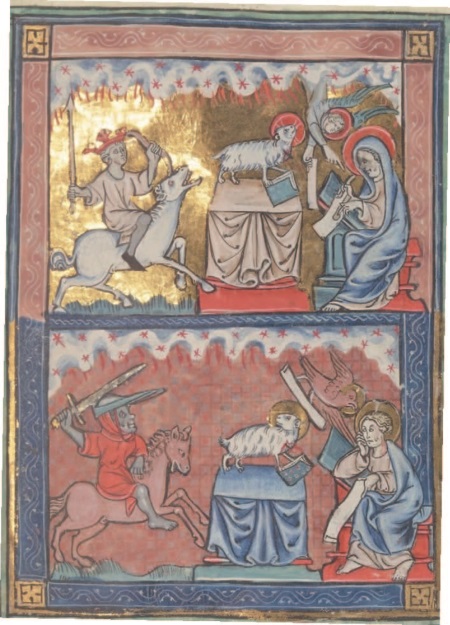 Рис. 7. Миниатюра изображает Агнца на престоле, снимающего печати и выпускающего всадников – специфическое воинство Господне: на белом коне – увенчанный королевской короной наездник с луком, а на рыжем (красном) – скачет воин, разящий мечом. Справа Иоанн фиксирует Откровение. Франция, конец XIII в. Paris. Bibliothèque nationale de France. FR. 13096, fol. 16r.