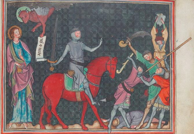 Рис. 8. Второе животное (телец) даёт послание «взять мир», и на рыжем (красном) коне выезжает всадник, облачённый в доспехи, кольчугу. Он несёт войну и раздор: люди побивают друг друга. Апокалипсис с комментариями Беренгадуса. Англия, 1320–1330. London. British Library. Add MS 17333, fol. 6r.