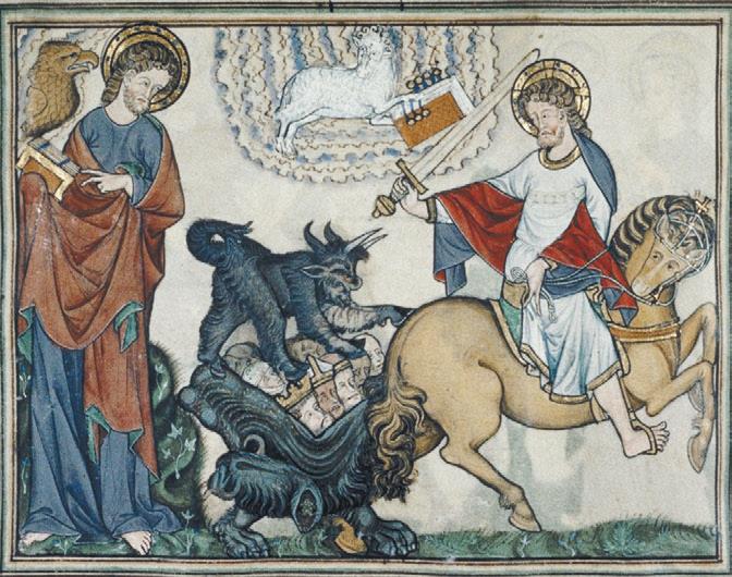 Рис. 9. Иоанн созерцает всадника на вороном (чёрном) коне с мерой-весами в руке. Франция, конец XIII в. Paris. Bibliothèque nationale de France. Lat. 14410, fol. 13v.