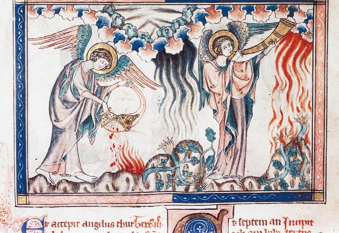 Рис. 15. Ангел низвергает на землю кадильницу, наполненную огнём жертвенника. Художник изобразил и глас первой трубы: град и огонь, смешанные с кровью, обрушились на землю; третья часть деревьев и трав сгорела (Откр. 8:5–7). Oxford. Bodleian Library. MS. Canon. Bibl. Lat. 62, fol. Or.