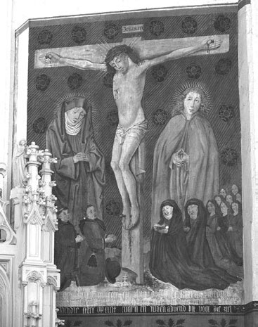 Рис 5. Фреска, изображающая «Распятие с донаторами» в соборе святого Иоанна предположительно выполнена либо Яном, либо Томасом ван Акеном около 1543–1554 гг. Также известно, что Ян ван Акен, дядя Босха, в 1430-х гг. работал в Брюгге – живописном центре Севера, как раз в то время, когда там жил и творил знаменитый художник, повлиявший на становление фламандской живописи – Ян ван Эйк. Ян официально носил звание художника.