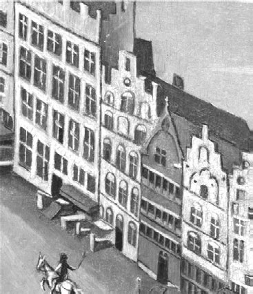 Рис 9. Фрагмент картины «Рынок тканей» около 1530 г. запечатлел пятиэтажный дом (слева от зеленого) Иеронима Босха с кирпичным ступенчатым фронтоном и зубчатыми стенами.