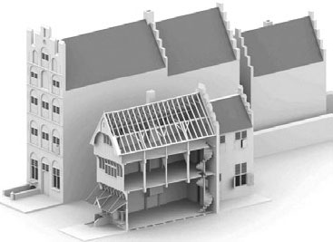 Рис 10. Дом Алейд и Иеронима состоял из трёх неравных частей: передней, задней и промежуточной, двор за домом простирался до самой реки, где начинался небольшой мост над каналом, также принадлежавший их участку. Маловероятно, что в столь огромном доме жили только два человека. Скорее всего, подвалы и задние части дома сдавались в аренду. С домом четы Босхов на этой 3D-модели сопоставлено другое небольшое здание, – это дом и мастерская Антония ван Акена, расположенный на северной стороне рыночной площади – место, где Босх провёл детство и годы своего обучения.