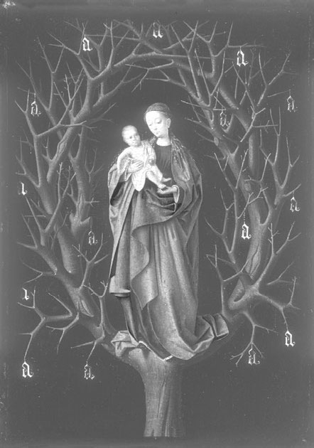 Рис. 11. Питер Кристус, около 1462–1465 гг. Весьма необычная картина изображает Деву Марию с младенцем на руках, стоящую на мёртвом стволе дерева, окружённую ветвями, будто колючими тернами венца. «Братство Богоматери сухого древа» привлекло элиту бургундского общества: иностранцев, дворян, художников и даже жену Филиппа Доброго Изабеллу Португальскую. Благодаря Братству Кристус привлекал новых богатых покровителей. Согласно легенде, созданной в XVII веке, Филипп Добрый основал братство, когда разбил французов после молитвы на образ Девы, увиденный им на сухом дереве. Однако Братство возникло намного раньше и явно сочетало дохристианские формы почитания деревьев (иногда изображалась Богоматерь дуба и Богоматерь вишни). А христианским образцом послужили образы из Иезекииля 17:24: «…И узнают все деревья полевые, что Я, Господь, высокое дерево понижаю, низкое дерево повышаю, зеленеющее дерево иссушаю, а сухое дерево делаю цветущим…». Образ может быть прочитан как горечь сухих плодов «Древа познания», увядших и тернистых из-за первородного греха, которые оживут только с пришествием Христа. Пятнадцать букв «A», свисающих с дерева, обычно рассматриваются как аббревиатуры «Ave» или «Ave Maria». Буква «А» также могла символизировать «древо» (лат. arbore) или обозначать инициал заказчика картины, члена братства – Ансельма Адорнеса. Богоматерь сухого древа. Museo Thyssen-Bornemisza, Madrid.