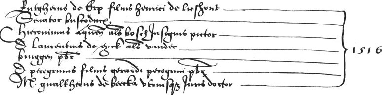 Рис. 13. Список умерших членов Братства Богоматери в 1516 века. Третья запись сверху сообщает о смерти Иеронима ван Акена, подписывавшегося Босхом: «Hieronimus Aquen [sis] al [i] s Bosch insignis Pictor». Archief van de Lieve Vrouwebroederschap, 1577 г., fol. 24–41v. Hertogenbosch.