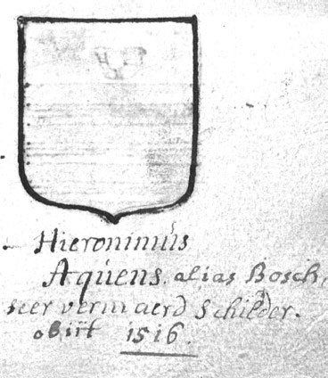 Рис. 14. В 1742 году Симон ван дер Вельде изготовил памятную коллективную книгу Братства, содержащую цветные изображения личных гербов всех членов сообщества. Хотя члены семьи Босха вряд ли использовали какие-либо гербовые отличительные знаки, художнику присвоили пустой щит (хотя сверху виднеется набросок рожка) с подписью: «Иеронимус Акенус, прозванный Босх, очень известный художник». Archief Illustre Lieve Vrouwe Broederschap, 146, fol. 76 r. Hertogenbosch.