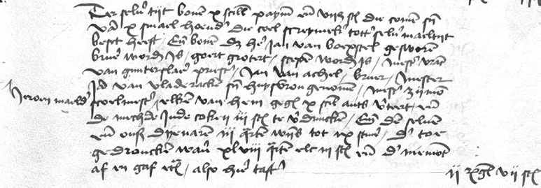 Рис 12. Изложение первой заупокойной мессы по Иерониму ван Акену от 9 августа 1516 века. Archief van de Illustre Lieve Vrouwe Broederschap, Rekeningboek 1513–1519 г., fol. 177 v. (строки 15–24). Hertogenbosch.
