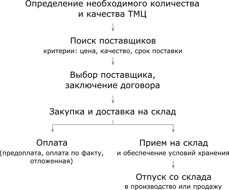 Цель бизнес-процесса – приобретение товарно-материальных ценностей (ТМЦ) в количестве, достаточном для обеспечения непрерывного процесса производства и продажи товаров. Здесь следует указать конкретный перечень ТМЦ, которые необходимы бизнесу (сырье, материалы, полуфабрикаты, требуемые для изготовления продукции, товары для перепродажи, хозяйственные и канцелярские принадлежности и т.д.).