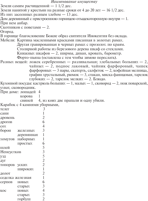 Инвентарь этого хозяйства сохранился по описи Волостного Головы, который ее составил, когда Одоевский покидал Елань и передавал барону Штейнгелю свое имущество. Опись довольно любопытна. Вот она с сохранением орфографии оригинала.