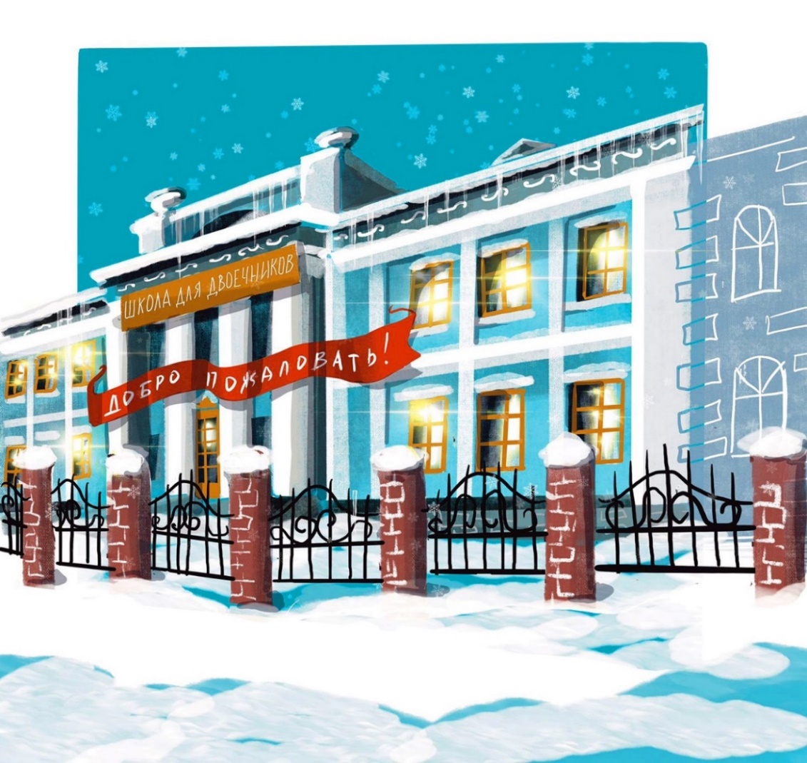 Ворота гостеприимно распахнулись, и по вычищенной от снега широкой дороге все потопали к дверям. У которых их поджидала прелестная молодая женщина, над чьей головой, на двери, из золотых букв складывались не менее прелестные слова: «Школа для двоечников».