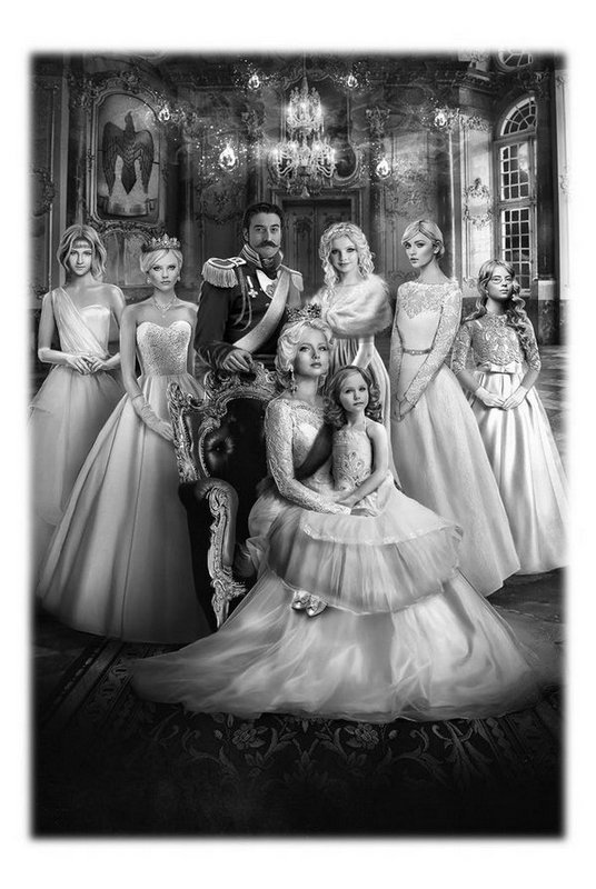 Посередине сидит высокая статная женщина с очень светлыми, почти платиновыми волосами. На голове – изящная корона с семью зубцами. Взгляд ее полон силы, сама она немного полновата, но это не портит ее удивительную холодную красоту. Королева Ирина-Иоанна в тяжелом и широком бальном платье с узким корсетом и орденскими лентами, надетыми наискосок через обнаженное плечо, держит на коленях младшую дочь – четырехлетнюю Каролину. Из-за их близости видно, насколько волосы дочери темнее, чем у матери: если у королевы платина, то у принцессы, насколько он может судить по черно-белому снимку, скорее русые. Каролина с лицом-сердечком и убранными назад волосами очень старается не шалить, и поэтому вид у нее немного испуганный.